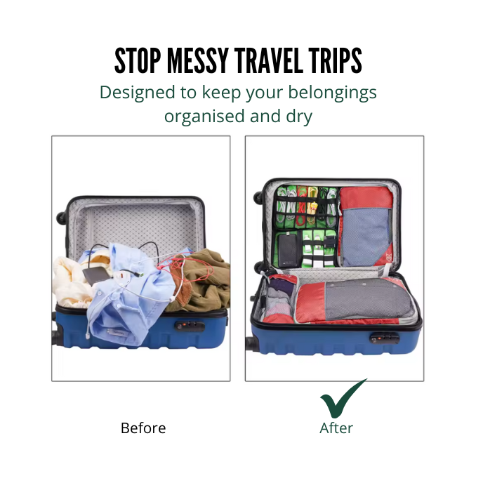 Say goodbye to messy suitcases and hello to easy organization with our 6-piece Travel Luggage Organizer Set. Designed for travelers who crave efficiency and simplicity, these lightweight, durable, and eco-friendly compression cubes help you maximize space while keeping your essentials neatly arranged.